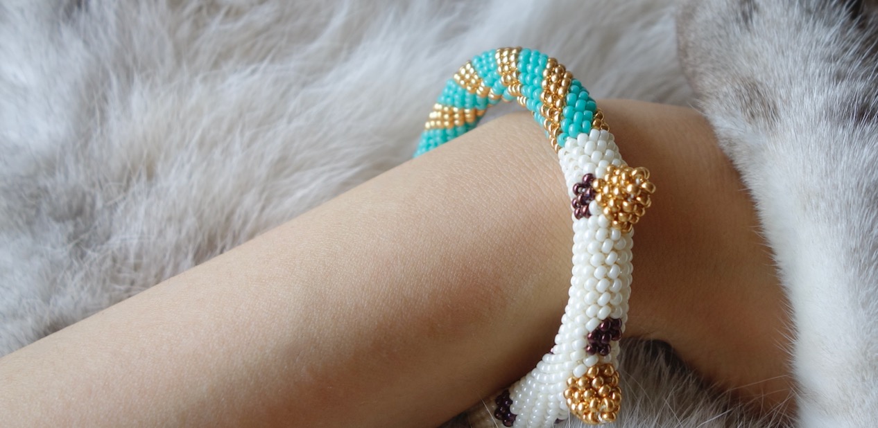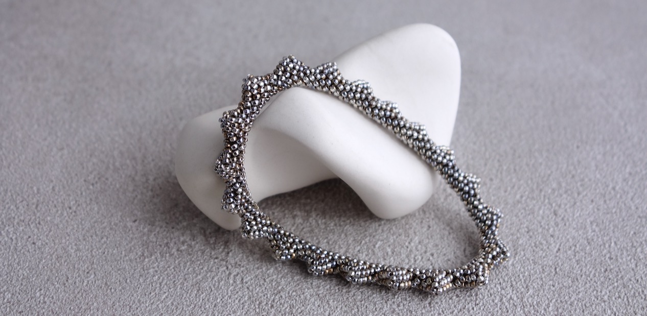 一本の糸に無数のビーズを通し、ひと目ずつ編み上げることで、硬質なモチーフにもあたたかさや柔らかさが宿ります。