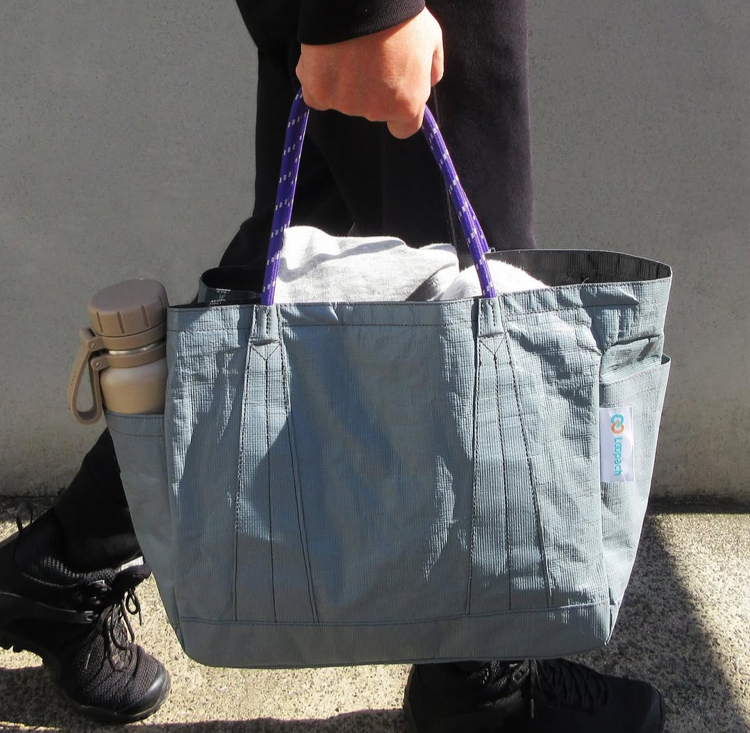【New Life Project】レジャーシートにリサイクルしたストレッチフィルムを溶かしたものを吹き付けた生地を開発しました。そのバッグコレクションを紹介します。