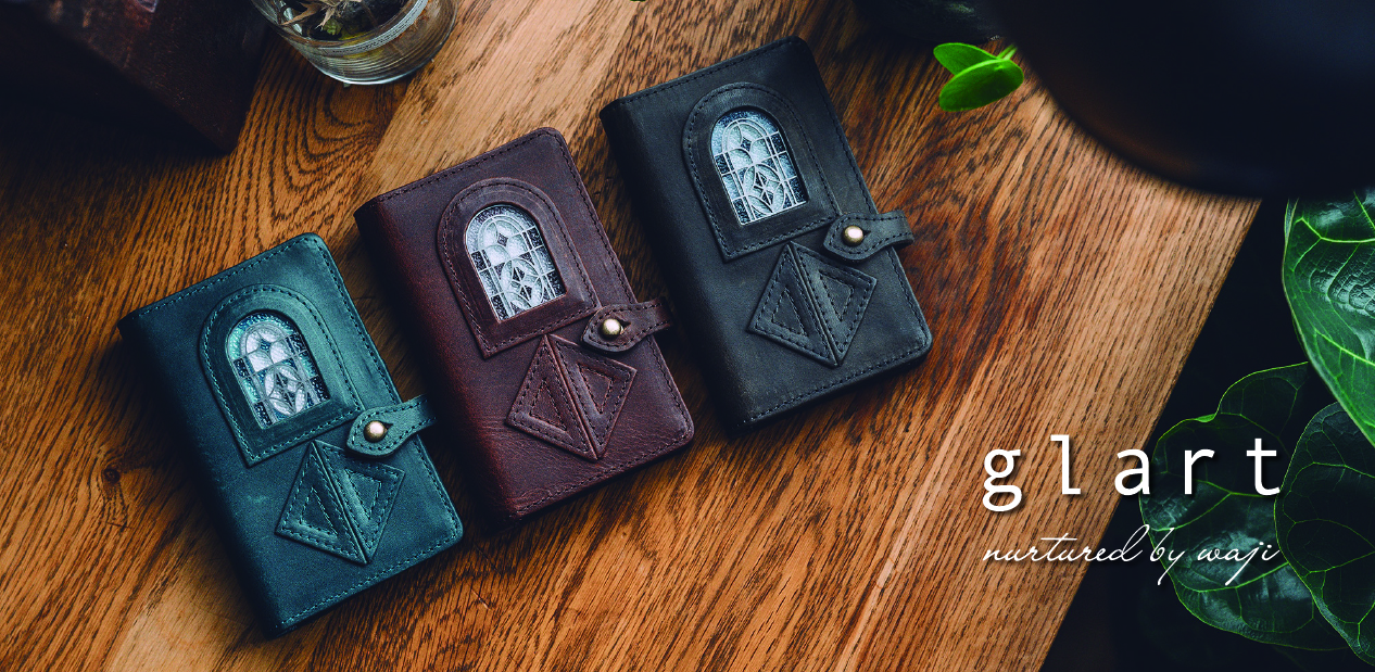 リアルガラスと革を融合させた、ステンドグラスドアデザインの革小物。